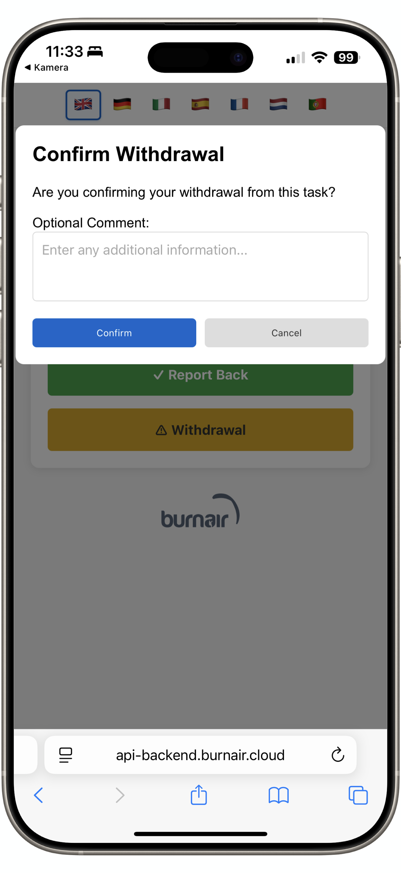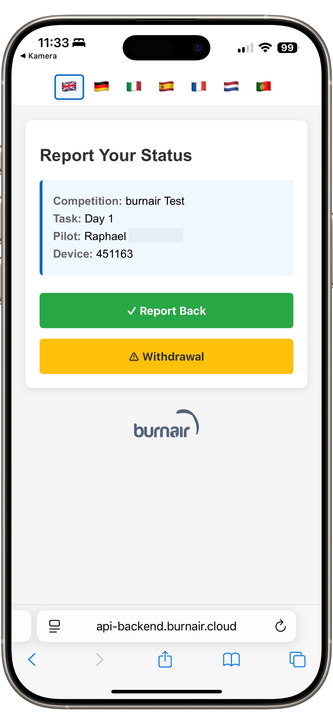 - Wähle Report Back aus, wenn du an einem sicheren Ort bist oder wähle Withdrawal aus, wenn du nicht mehr am Rennen teilnimmst
