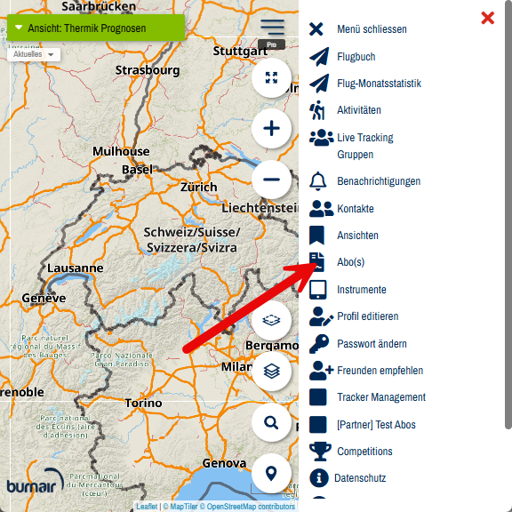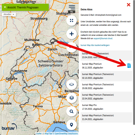 Wie kann ich eine Rechnung für mein burnair Map Abo herunterladen? 2. Dezember 2025 16:29 Aktualisiert Antwort Öffne die burnair Map am Browser oder am Handy innerhalb der App Navigiere zum Menü Wähle "Abos(s)" aus Lade für dein burnair Map Abo die Rechnung herunter Verwandte Beiträge Wie kann die burnair Map auf einer Club Webseite eingebunden werden? Kommentare 0 Kommentare Bitte melden Sie sich an, um einen Kommentar zu hinterlassen.